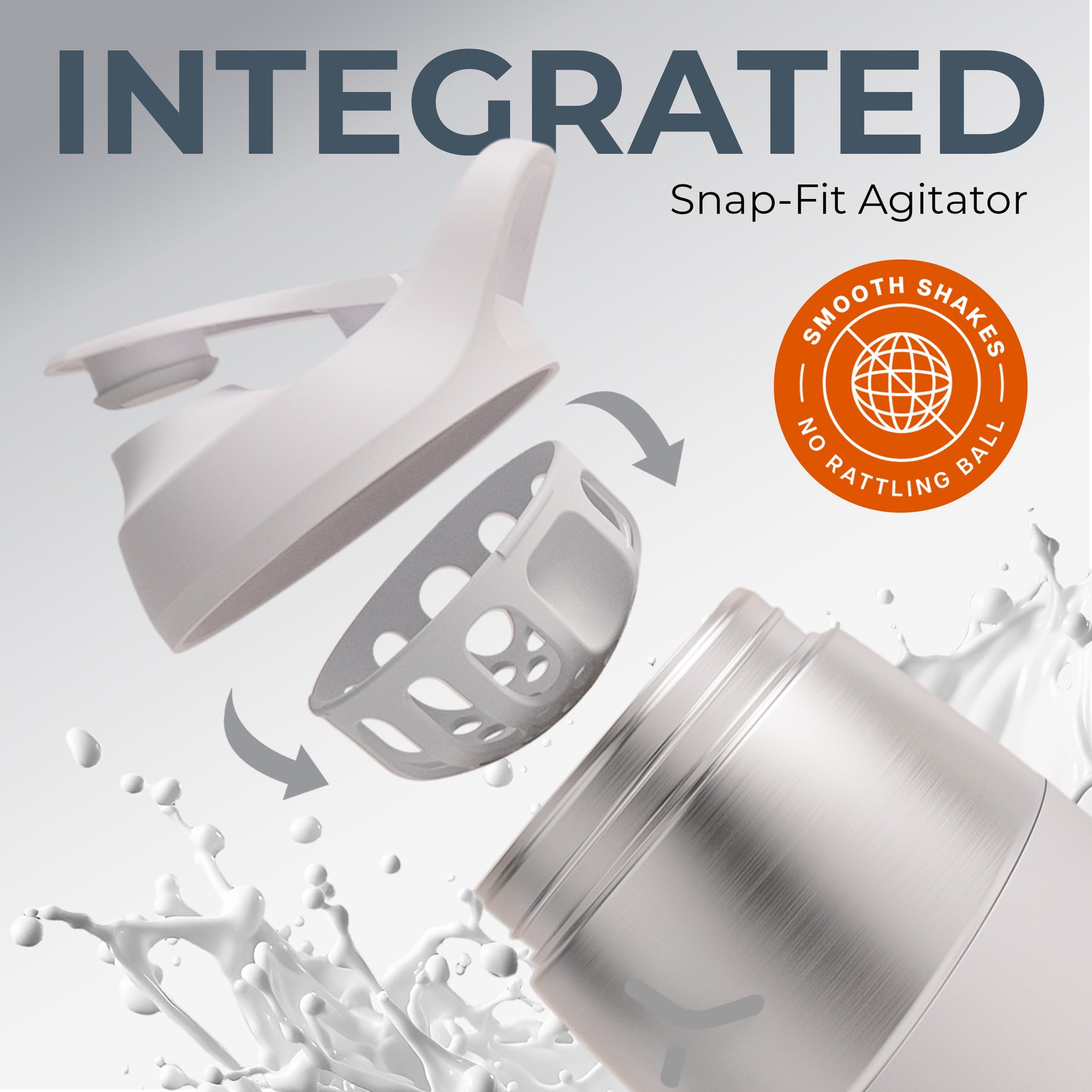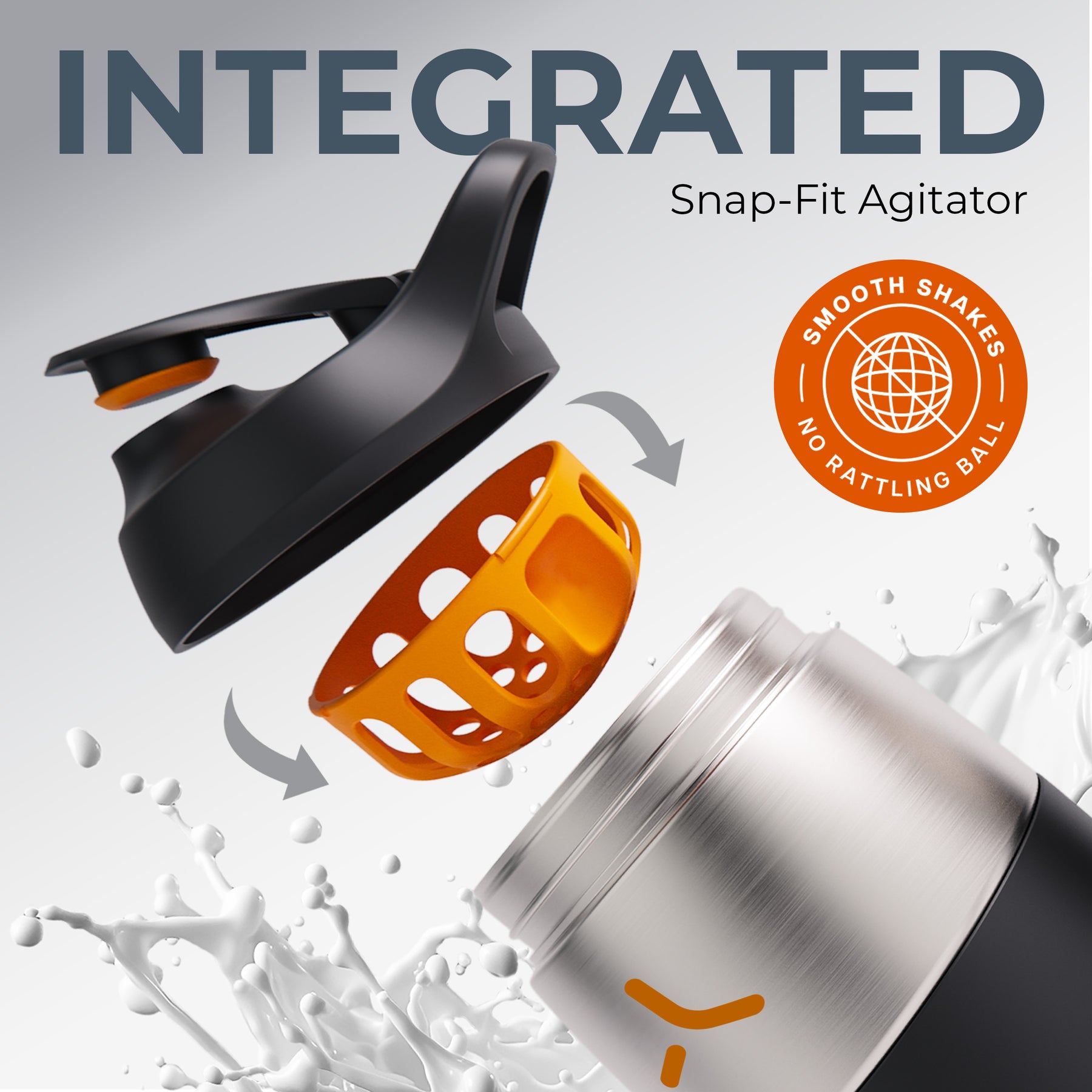 Crafted from premium stainless steel, our PURSUIT Stainless Steel protein shaker boasts an impressive 32oz (950ml) capacity, giving you plenty of room for your favorite drinks. The soft-touch, non-slip silicone sleeve provides a secure, comfortable grip for effortless handling, even on the go. With an integrated agitator, it delivers smoother, more consistent mixing every time. And, thanks to its unbeatable leakproof design, you can carry it confidently without worrying about spills.